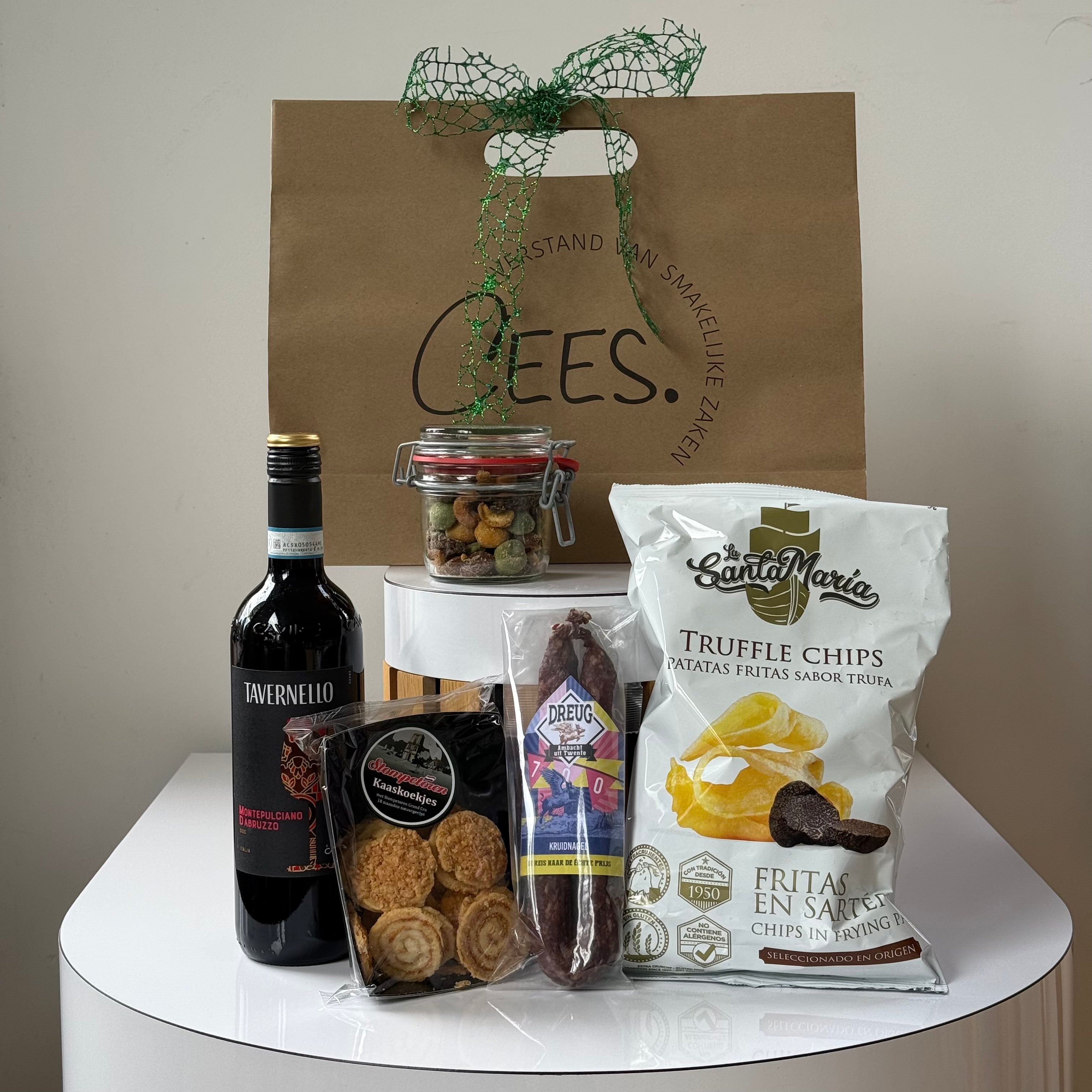 Kerstpakket met de meest favoriete producten van onze winkels, verpakt in de Kersttas van CEES. Makkelijk, duurzaam en modern.